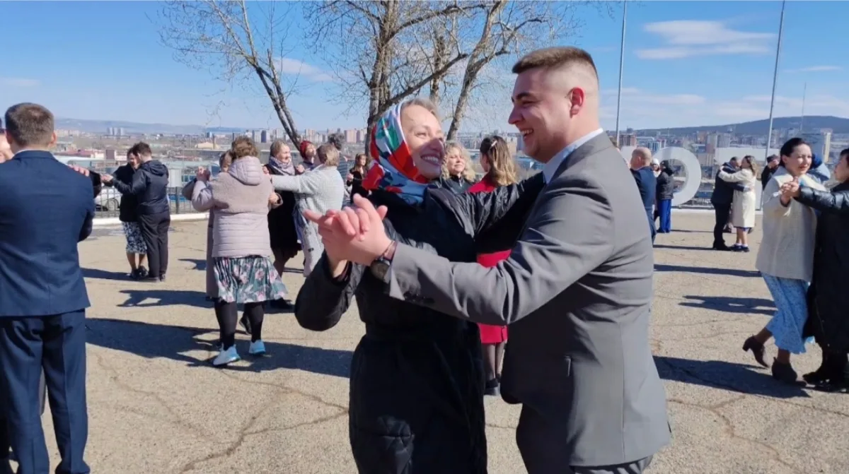 Несмотря на сильный ветер, более 70 добровольцев Забайкальской магистрали в преддверии 81-й годовщины Победы в Великой Отечественной войне танцевали под музыку «Майского вальса».