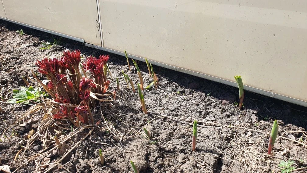 Порадовало: несмотря на то, что еще и снег пятнами лежит, марьины коренья и молодая травка уже пробились из-под земли. И тянутся к весеннему солнышку.
