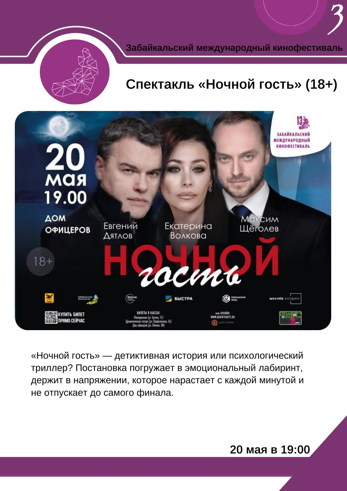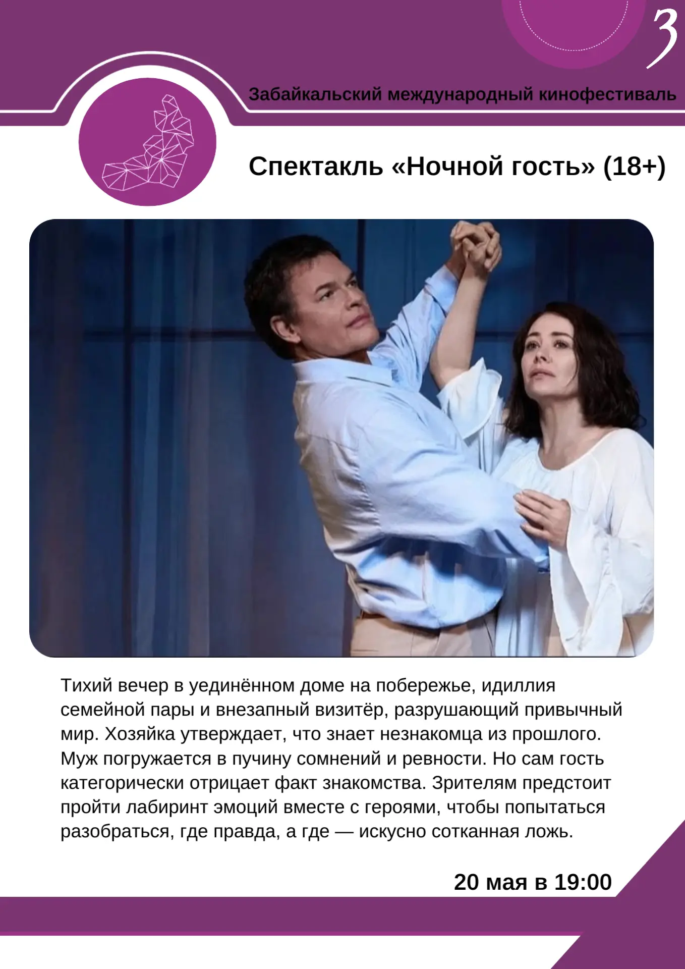 Мероприятие состоится на сцене Драматического театра 20 мая в рамках Забайкальского международного кинофестиваля. В состав труппы вошли заслуженный артист РФ Евгений Дятлов, Екатерина Волкова, Максим Щёголев. Подробности — смотрите в карточках.