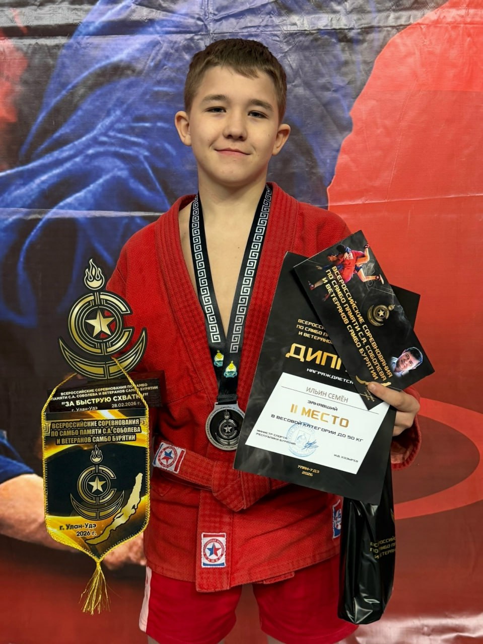 Читинский самбист, учащийся краевой кадетской школы Семён Ильин завоевал серебряную медаль на Всероссийских соревнованиях по самбо имени Сергея Анатольевича Соболева, которые прошли в городе Улан-Удэ с 27 февраля по 1 марта.