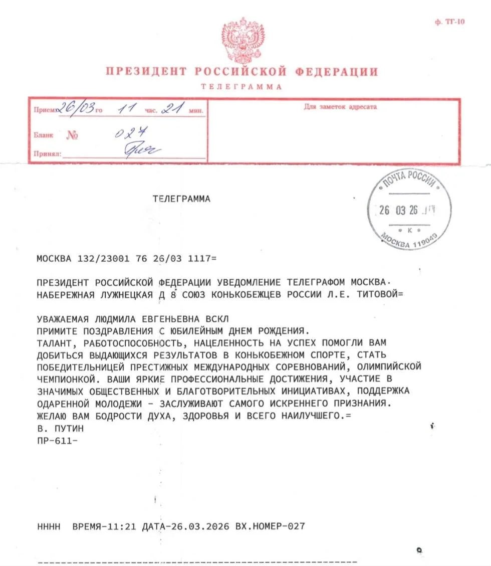 Президент России Владимир Путин направил поздравительную телеграмму в которой поздравил забайкальскую олимпийскую чемпионку Людмилу Титову.